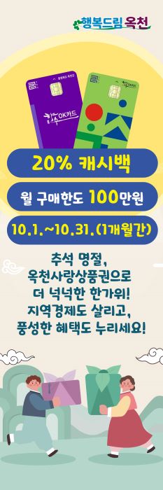 옥천군이 2025년 본예산에 군비를 적극 반영하는 등 선제적 재정 운영을 통해 이번 혜택을 마련해 10월 한 달 동안 군민들은 옥천사랑상품권을 월 100만 원 사용 시 최대 20만 원의 캐시백 혜택을 받을 수 있게 됐다.