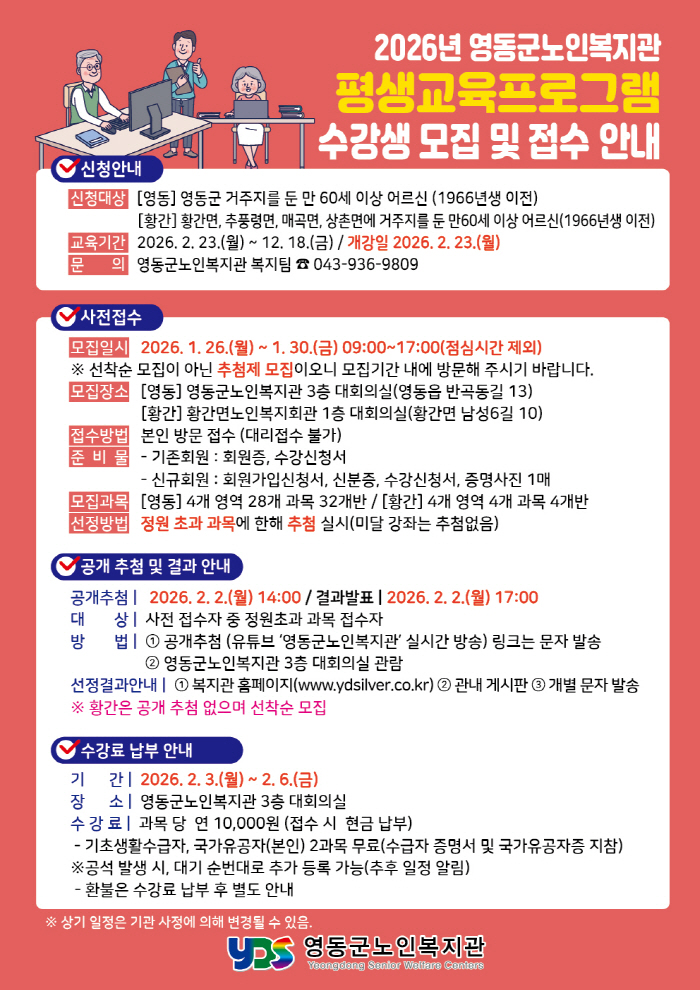 지역 어르신들의 활기찬 노후 생활 지원과 평생학습 기회 확대를 위해 ‘2026년 평생교육프로그램’ 수강생을 모집한다고 밝혔다. 영동군에 거주하는 만 60세 이상 어르신을 대상으로 하며, 2월 23일부터 12월 18일까지 약 10개월간 운영된다.