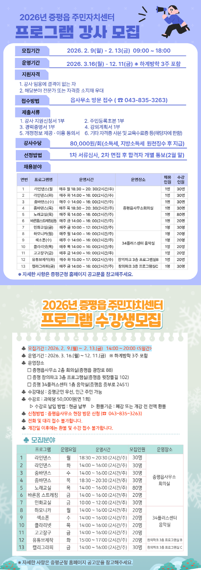 충북 증평군 증평읍 주민자치센터가 오는 2월 9일부터 13일까지 5일간 2026년도 주민자치센터 프로그램 수강생과 강사를 모집한다.