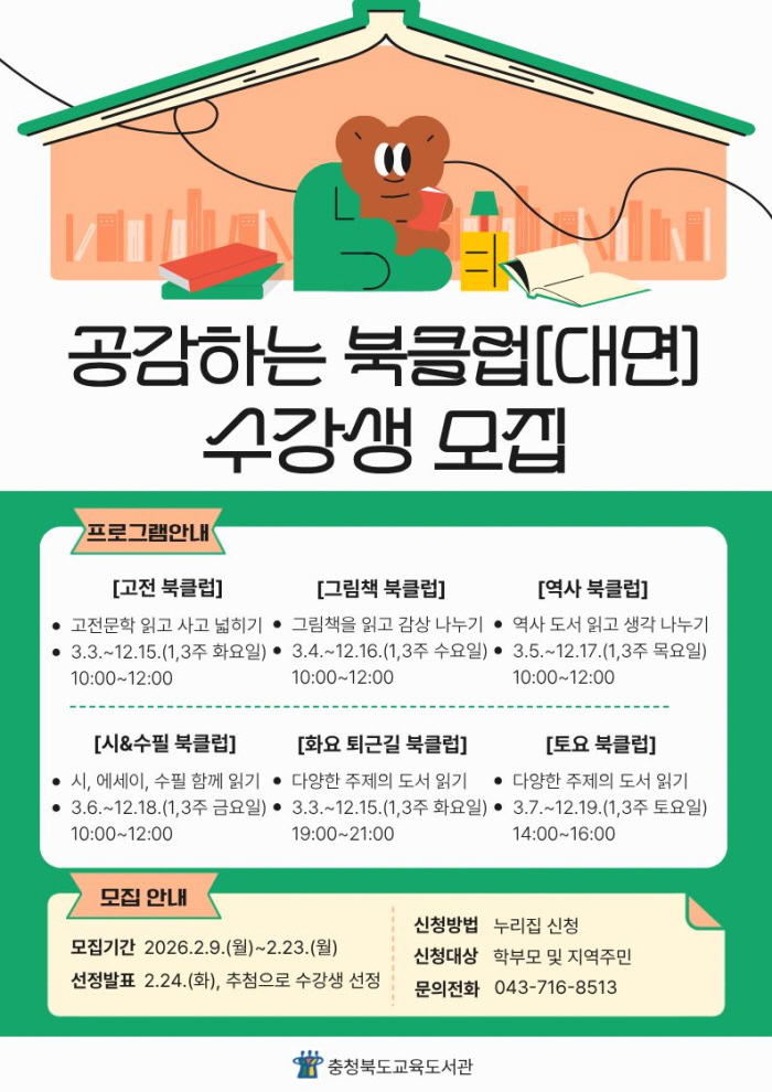 충청북도교육청 직속기관 교육도서관(관장 노재경)은 오는 23일까지 책을 매개로 지역주민과 소통하고 공감하는 독서문화를 확산하기 위해 <공감하는 북클럽> 수강생을 모집한다.