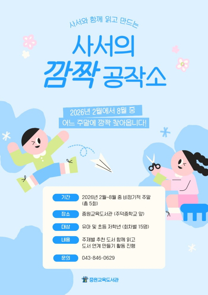 신기철 중원교육문화원장은 “사서가 직접 책을 읽어주고 함께 만드는 활동을 통해 아이들이 책과 도서관을 더욱 친근하게 느낄 수 있을 것”이라며 “앞으로도 독서와 체험을 결합한 다양한 프로그램을 지속적으로 운영하겠다.”라고 말했다.