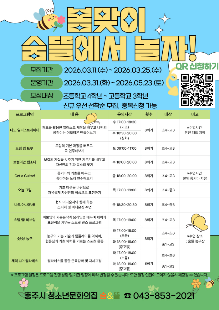 이번 봄맞이 프로그램은 3월부터 6월까지 학기 중에 진행되며, 청소년들에게 꾸준히 인기를 얻고 있는 ‘나도 일러스트레이터’, ‘드럼 컴 트루’, ‘보컬미안 랩소디’, ‘Get a Guitar!’등 프로그램과 함께 기초 데생을 바탕으로 자유롭게 작품 활동을 해보는 미술 프로그램 ‘오늘 그림’, 현직 아나운서와 함께 스피치와 아나운싱을 배우는 ‘나도 아나운서!’, 스트릿 댄스 기반의 ‘스텝 업! 비보잉’, 팀워크와 체력을 기르는 ‘슛슛! 농구’, 자세 교정과 근력 강화를 돕는 ‘체력 UP! 필라테스’ 등 숨뜰 내·외부 공간을 활용하여 9개의 다양한 활동이 새롭게 마련됐다. 신청 방법은 숨&뜰 홈페이지 또는 포스터 내의 구글폼 QR코드를 통해 신청할 수 있다.