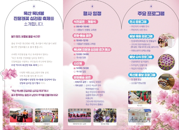 한편 제17회 옥산 옥녀봉 진달래꽃 십리길 축제는 오는 4월 4일 한울림교육원과 옥녀봉 일원에서 개최된다. 수채화·사진 등 주민자치 전시를 비롯해 문화예술 공연, 진달래 포토존, 인생세컷, 전통놀이 체험 등 다양한 프로그램이 마련돼 방문객들에게 봄나들이의 즐거움을 선사할 예정이다.