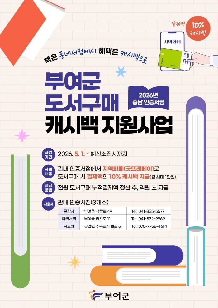 사업 기간은 오는 5월 1일부터 연말까지 적용되며, 예산 소진 시 사업이 조기 종료될 수 있다. 관내 인증서점은 전년도 2개소에서 1개소가 추가된 ▲문광사(부여읍) ▲학원서림(부여읍) ▲북토이(규암면) 총 3개소이다.