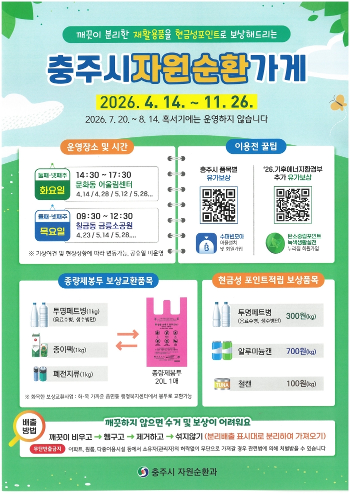 충북 충주시는 시민들의 분리배출 의식을 높이고 재활용 자원 수거율을 제고하기 위해 오는 11월까지 관내 2개소에서 ‘충주시 자원순환가게’를 시범 운영한다.